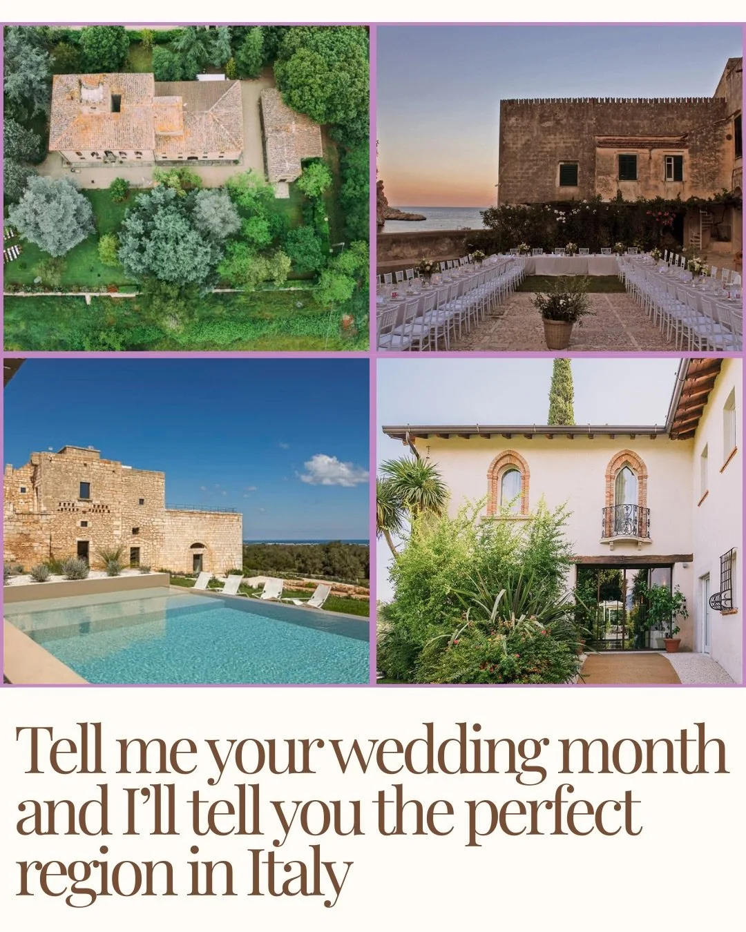 I specialise in Tuscany, Rome & its countryside, the Amalfi Coast, Puglia, and the Lakes region, but I can work across most of Italy with my trusted network of local suppliers.
